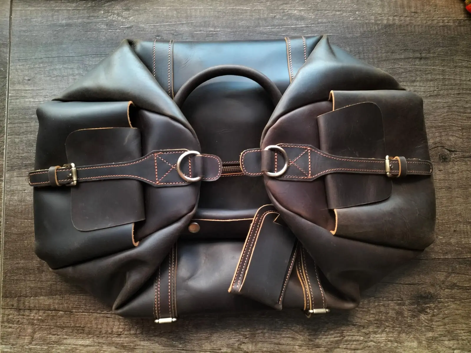 - Two-sided exterior leather pockets